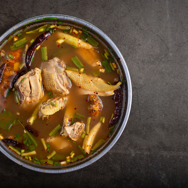 Comforting chicken broth with tender meat.